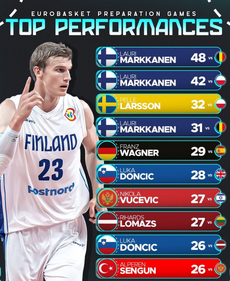 热身赛单场得分榜Top10如上图,马尔卡宁独占三席,详情如下: